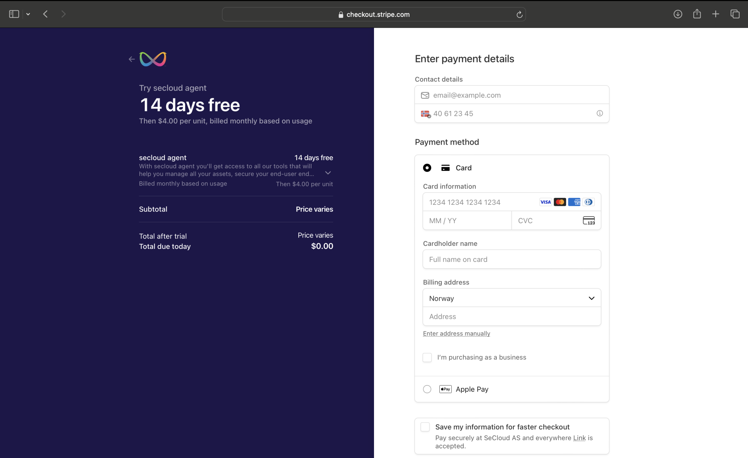 In the Stripe gateway you enter all necessary information like credit card, adresses, company name, VAT number etc. This gives us the opportunity to start setting up your account in the background.