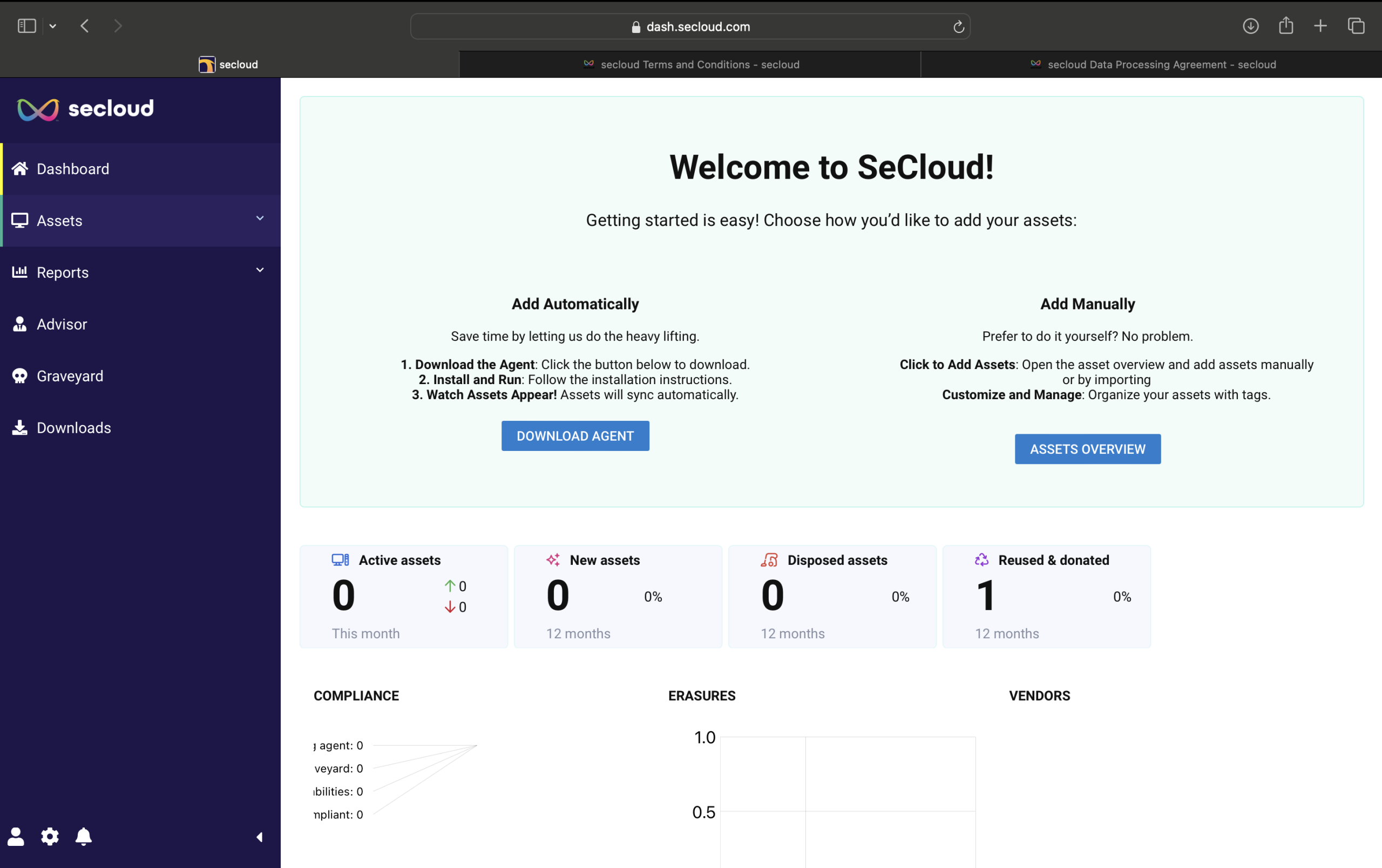 We’ll automagically log you in to the secloud dashboard so you can start adding assets or start erasing your devices right away.